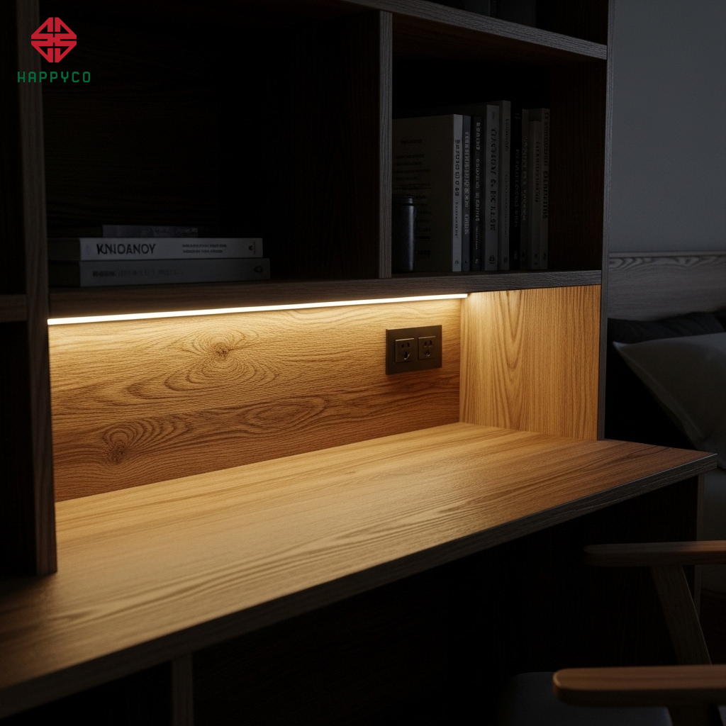 Kỹ thuật phay CNC giấu LED: Happy Décor phay các rãnh âm sâu bên dưới kệ sách hoặc hộc tủ làm việc. Dải LED được dán sâu vào trong và trang bị nắp đậy mika tán quang góc hẹp.