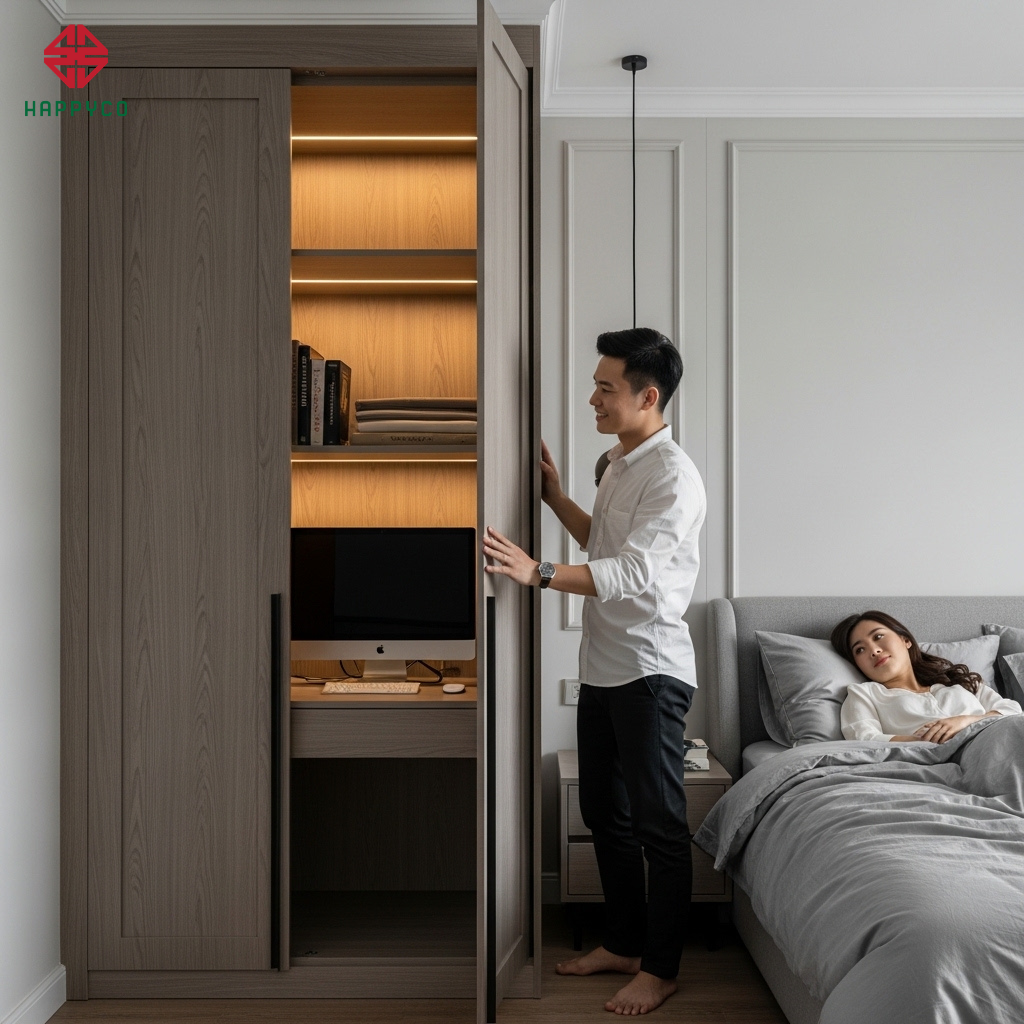 Một góc làm việc thông minh trong phòng ngủ không chỉ là tiết kiệm diện tích. Đó là sự tôn trọng và thấu hiểu lẫn nhau giữa hai vợ chồng.