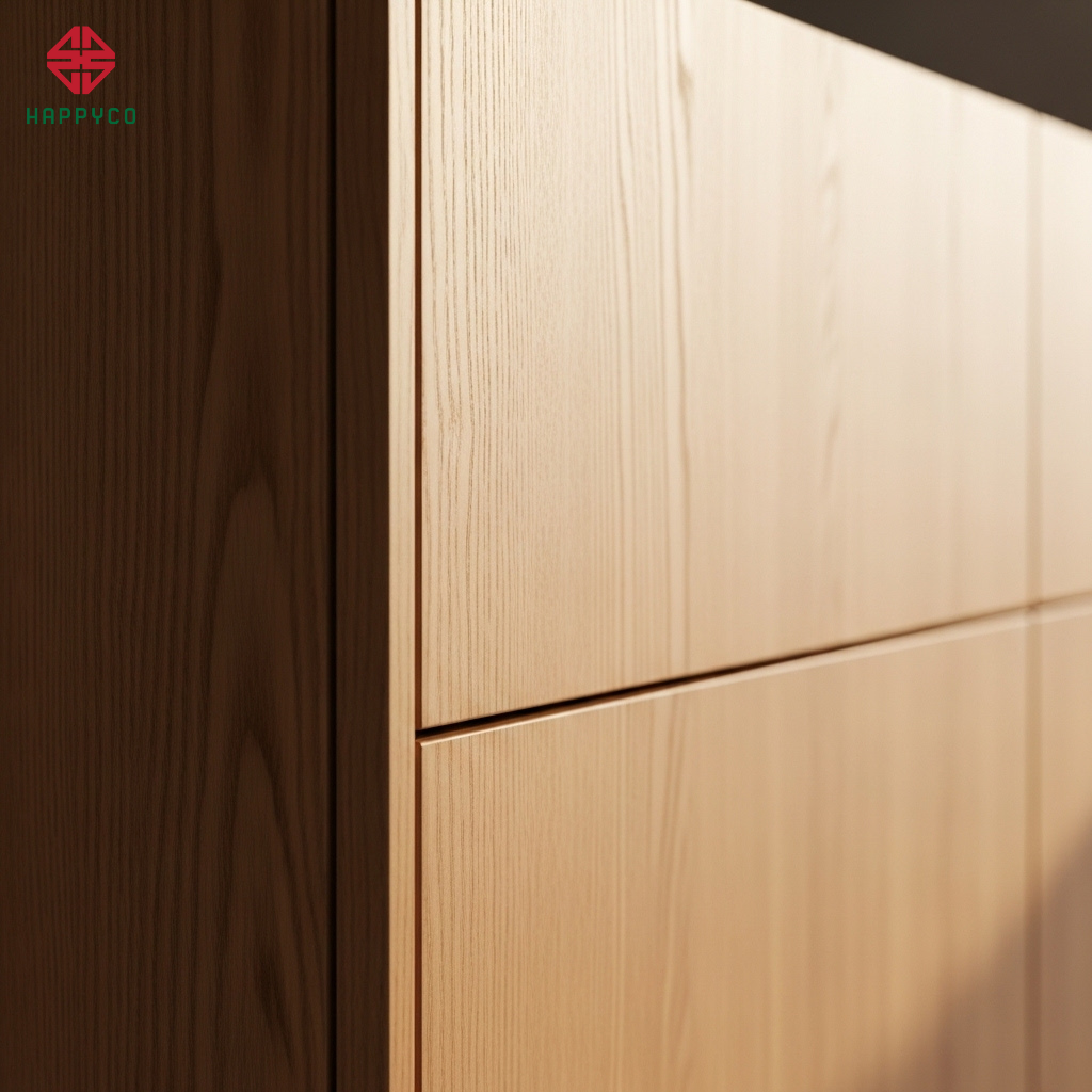 Kỹ thuật dán cạnh No-Line: Happy Décor xử lý các cạnh ván bằng công nghệ dán nhiệt dẻo, tạo ra sự đồng nhất giữa mặt cánh và cạnh cánh. Các khe hở giữa hai cánh tủ (Shadow Line) được duy trì ở mức 3mm đều tăm tắp trên toàn bộ hệ tủ.