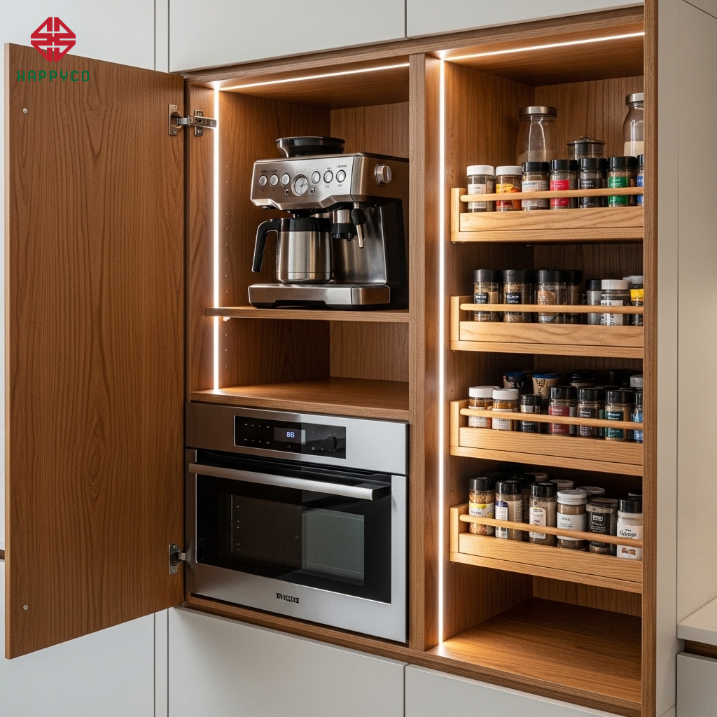 Trong xu hướng thiết kế không gian mở (Open Concept), ranh giới giữa phòng khách và phòng bếp đang dần xóa nhòa. Tuy nhiên, sự bừa bộn sau mỗi lần nấu nướng thường là "kẻ thù" của thẩm mỹ. Kỹ thuật Pocket Door ra đời như một cuộc cách mạng: những cánh tủ khổng lồ có thể mở ra và trượt gọn vào hai bên hông tủ, biến mất hoàn toàn để lộ ra một trạm pha chế cà phê, một quầy bar mini hay toàn bộ khu vực lò nướng hiện đại