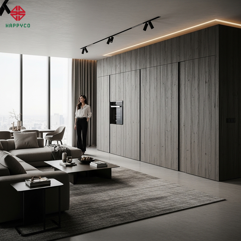 Giải pháp vật liệu: Chúng tôi ưu tiên sử dụng ván HMR nén tỷ trọng cao. Với đặc tính chống ẩm vượt trội và cấu trúc sợi gỗ bền vững, ván HMR giữ được độ phẳng lý tưởng ngay cả với những cánh tủ kịch trần.