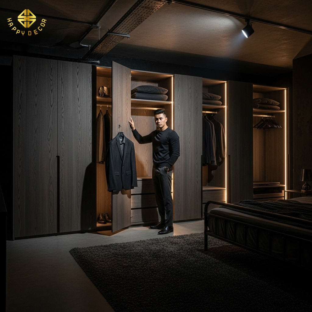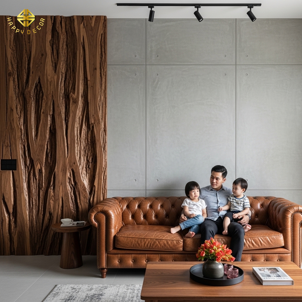 Tại Happy Décor, chúng tôi thi công phong cách này bằng cách sử dụng các dòng ván gỗ vân đậm, bề mặt gai, phối hợp với ánh sáng vàng đặc trưng để tạo ra một tổ ấm đậm chất "nghệ" cho gia chủ.