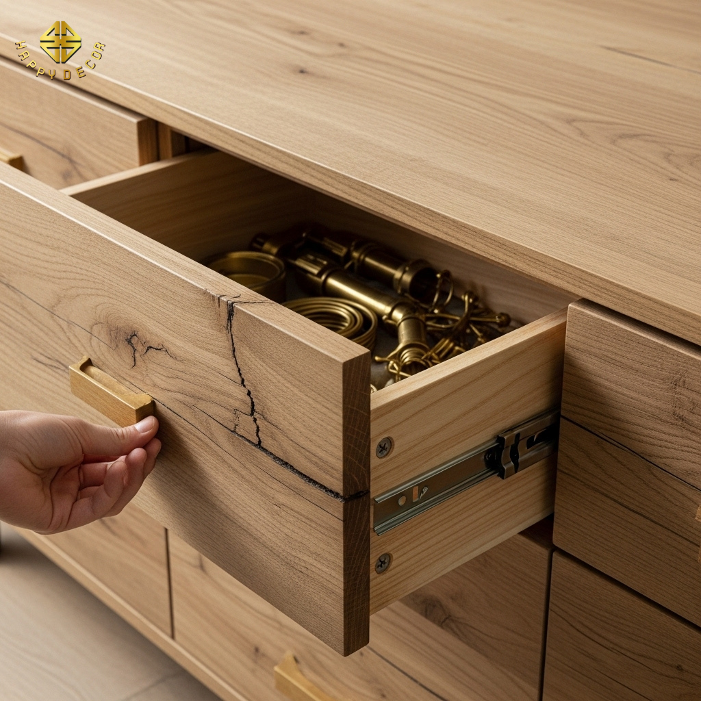 Ray trượt âm tích hợp giảm chấn: Dù bên ngoài có vẻ thô mộc, nhưng bên trong mọi hộc kéo đều phải vận hành cực kỳ trơn tru. Chúng tôi sử dụng các hệ ray âm cao cấp, cho phép ngăn kéo chịu tải trọng lớn (như chứa bình rượu hoặc đồ gốm nặng) mà vẫn trượt êm ru, không một tiếng động.