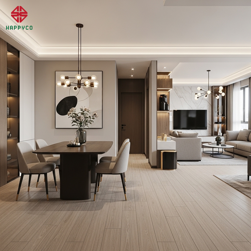 Xử lý mối nối và điểm giao: Tại những vị trí giao nhau giữa sàn gỗ và tường, giữa đá và gỗ, chúng tôi sử dụng các nẹp âm hoặc kỹ thuật ghép mòi tinh xảo để xóa bỏ mọi tì vết. Sự liền mạch này tạo nên một dòng chảy không gian không bị đứt quãng.