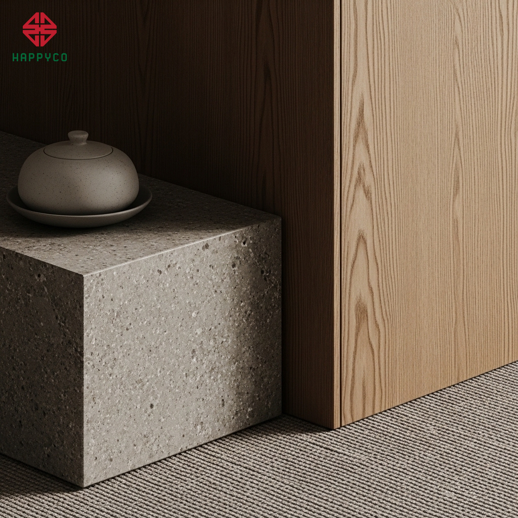 Sự kết hợp đa chất liệu: Happy Décor phối hợp giữa đá nung kết bề mặt nhám mờ, gỗ tự nhiên với vân sâu và vải lanh (linen) hoặc da thật. Sự tương phản giữa cái lạnh của đá và sự ấm áp của gỗ tạo nên một không gian có sức sống và giàu tính nghệ thuật.