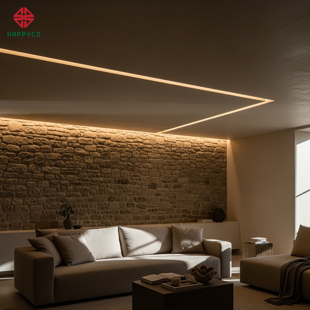 Hệ thống chiếu sáng gián tiếp: Thay vì sử dụng đèn chùm rườm rà, chúng tôi ưu tiên các dải đèn LED âm trần, âm vách với chỉ số hoàn màu (CRI) cao. Ánh sáng được giấu kín một cách tinh tế, tạo ra những dải sáng hắt nhẹ nhàng lên bề mặt vật liệu, làm nổi bật các thớ gỗ hay vân đá một cách tự nhiên nhất.
