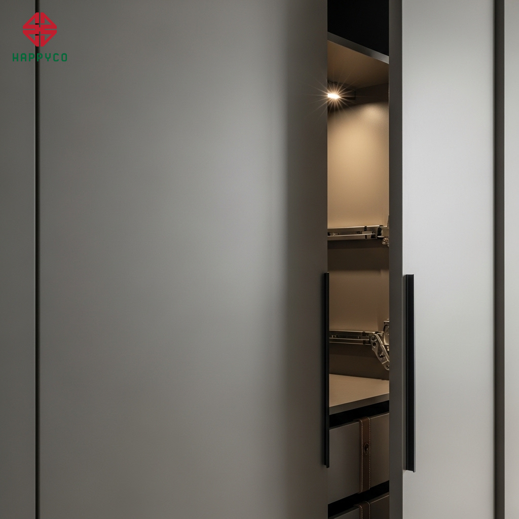 Hệ thống ray lùa và bản lề âm: Chúng tôi loại bỏ hoàn toàn những phụ kiện thô kệch lộ ra bên ngoài. Các hệ cửa lùa trần (Ray lùa âm) giúp không gian trở nên phẳng phiu tuyệt đối. Mọi chuyển động đều được trợ lực và giảm chấn toàn phần, tạo ra cảm giác mượt mà và êm ái khi sử dụng.