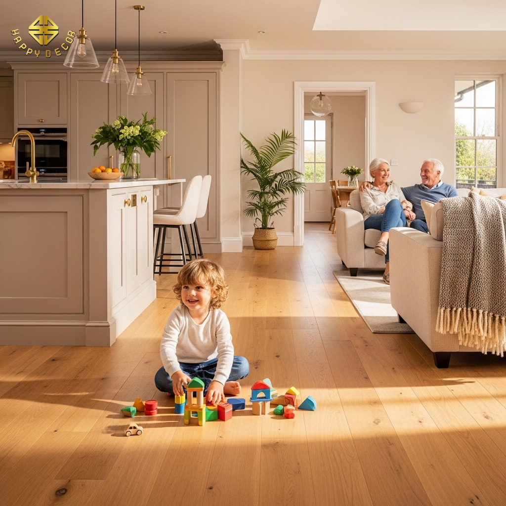 Ván Super E0 – Lời cam kết sức khỏe: Tại Kho Mộc, chúng tôi chỉ tuyển chọn những tấm ván có nồng độ phát thải Formaldehyde gần như bằng không. Điều này đặc biệt quan trọng khi phòng khách là nơi trẻ nhỏ thường xuyên lăn lộn trên sàn và tiếp xúc trực tiếp với đồ nội thất.