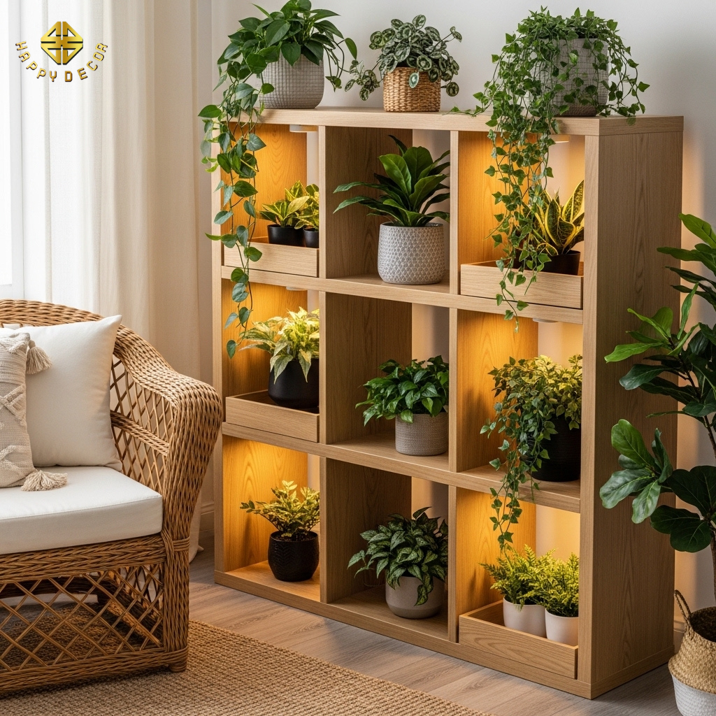 Kệ gỗ tích hợp hệ thống tưới âm: Happy Décor thiết kế các module kệ gỗ có khay chứa nước và hệ thống đèn chuyên dụng cho cây trong nhà. Sự ấm áp của gỗ Kho Mộc kết hợp với sắc xanh của cây Olive hay trầu bà tạo nên một bộ lọc không khí tự nhiên, giúp giảm nồng độ bụi mịn và tăng cường Oxy cho căn phòng.
