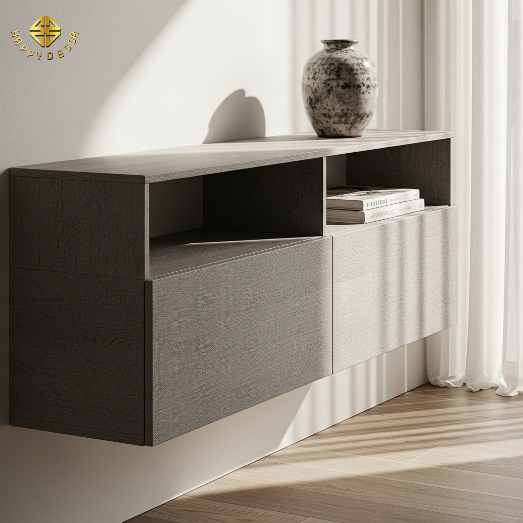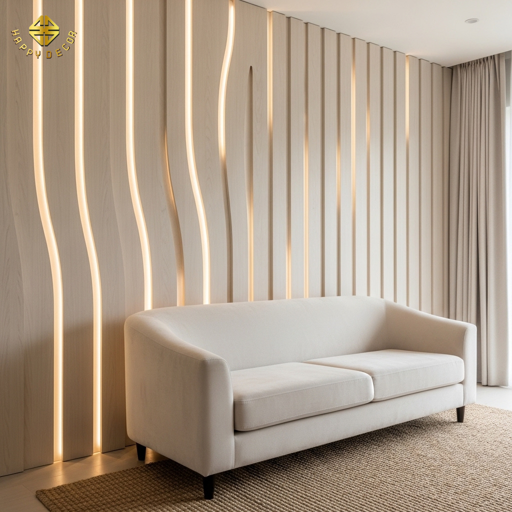 Kỹ thuật Bo tròn Radius lớn: Happy Décor ứng dụng máy CNC hiện đại để xử lý tất cả các cạnh kệ tivi, bàn trà và vách ốp theo bán kính cong lớn. Sự mềm mại này giúp dòng khí lướt đi nhẹ nhàng, không bị đứt gãy, mang lại sự bình an và thịnh vượng cho gia chủ.
