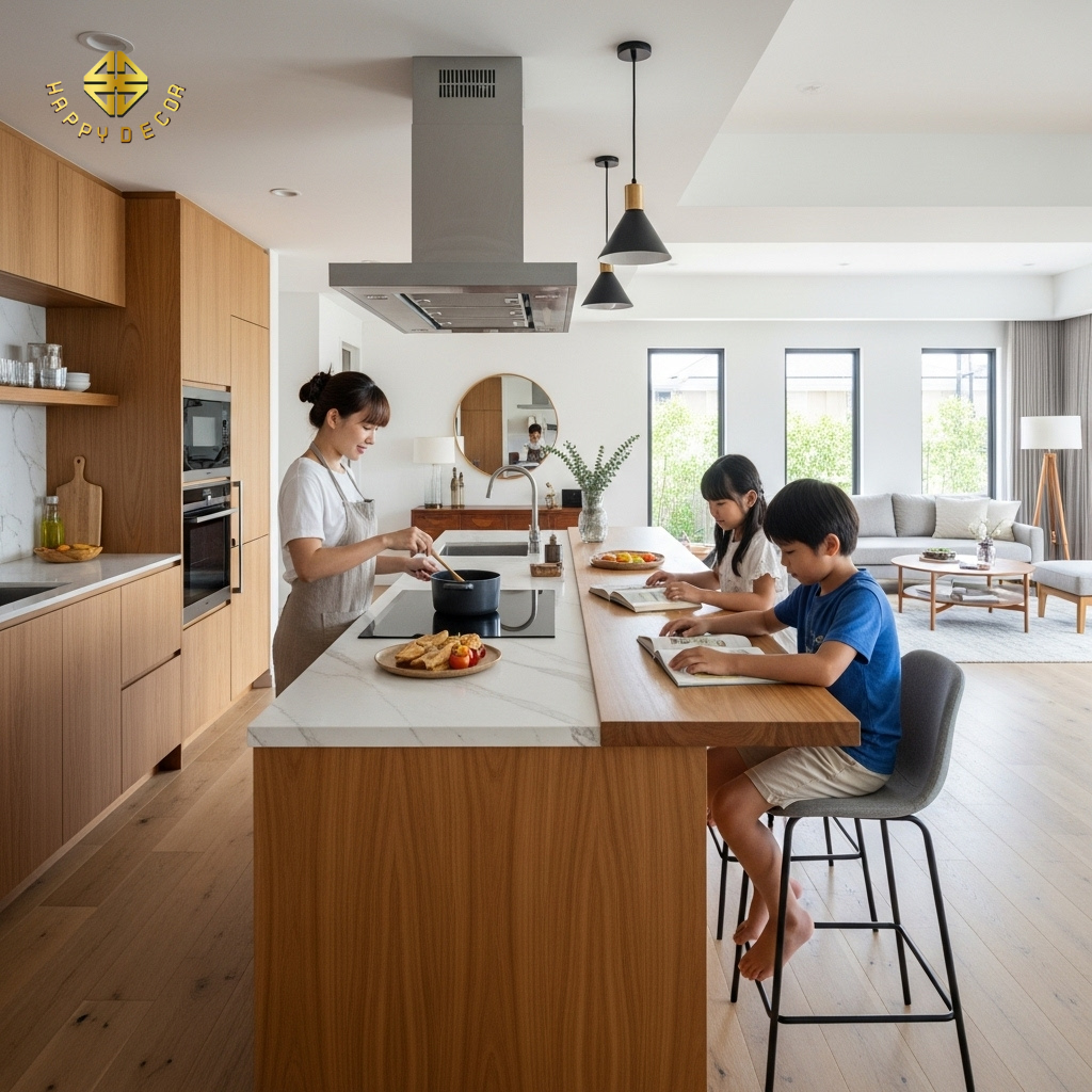 Trong không gian mở, bàn đảo bếp (Kitchen Island) đóng vai trò là "biên giới" mềm giữa khu vực làm việc (nấu nướng) và khu vực thư giãn.