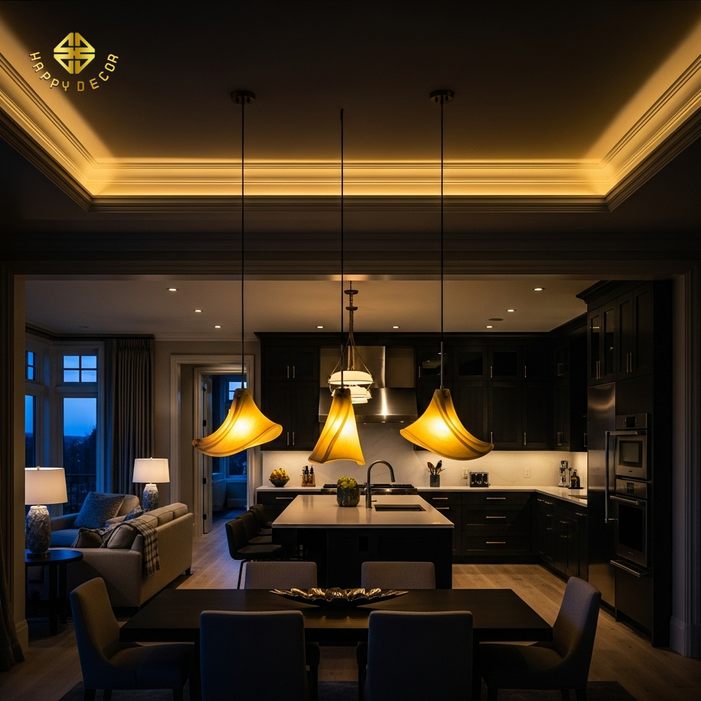 Kỹ thuật trần: Thiết kế một hệ trần thạch cao giật cấp với viền gỗ hoặc đèn LED định vị riêng cho khu vực bàn ăn. Cảm giác có một "mái nhà" nhỏ bên trong không gian lớn sẽ tạo ra sự ấm cúng kỳ lạ khi cả nhà quây quần bên mâm cơm.