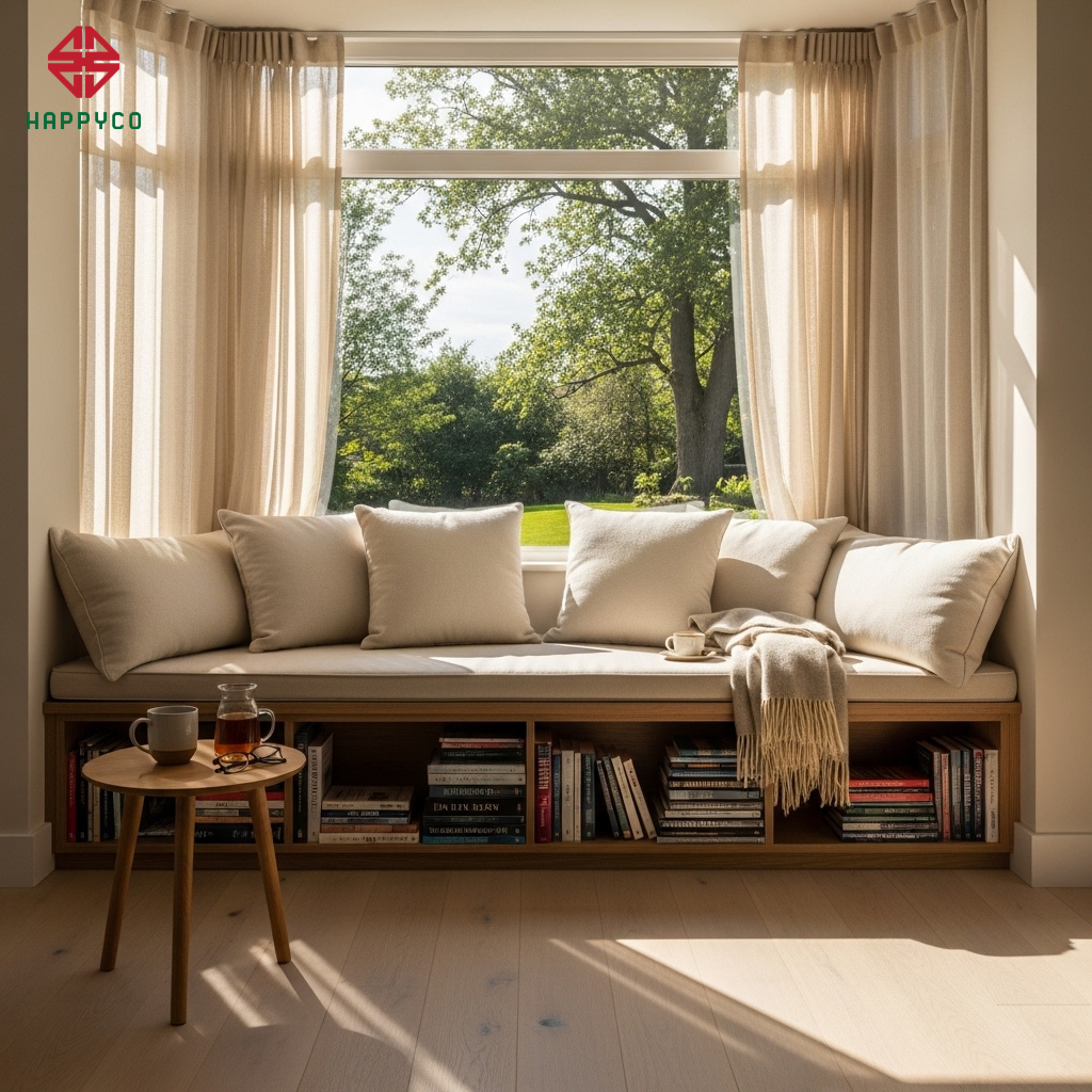 Góc thư giãn đa năng: Một bệ cửa sổ rộng (bay window) hay một góc trà mộc mạc với ánh sáng tự nhiên sẽ là nơi lý tưởng để vợ chồng cùng nhâm nhi tách cà phê hoặc ông bà kể chuyện cho cháu nghe. Chính những góc nhỏ này lại là nơi lưu giữ nhiều kỷ niệm gia đình nhất.