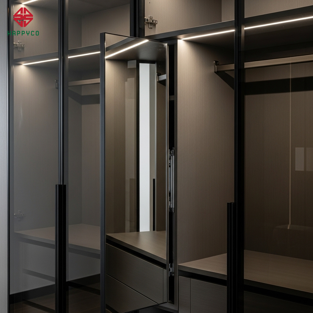 Tủ áo cánh kính xám khói: Thay vì gương soi lộ liễu, chúng tôi sử dụng cánh kính khung nhôm màu xám khói cho tủ áo. Kính xám vừa tạo độ sâu kiến trúc, vừa có độ phản chiếu mờ, không gây xung sát như gương phẳng.
