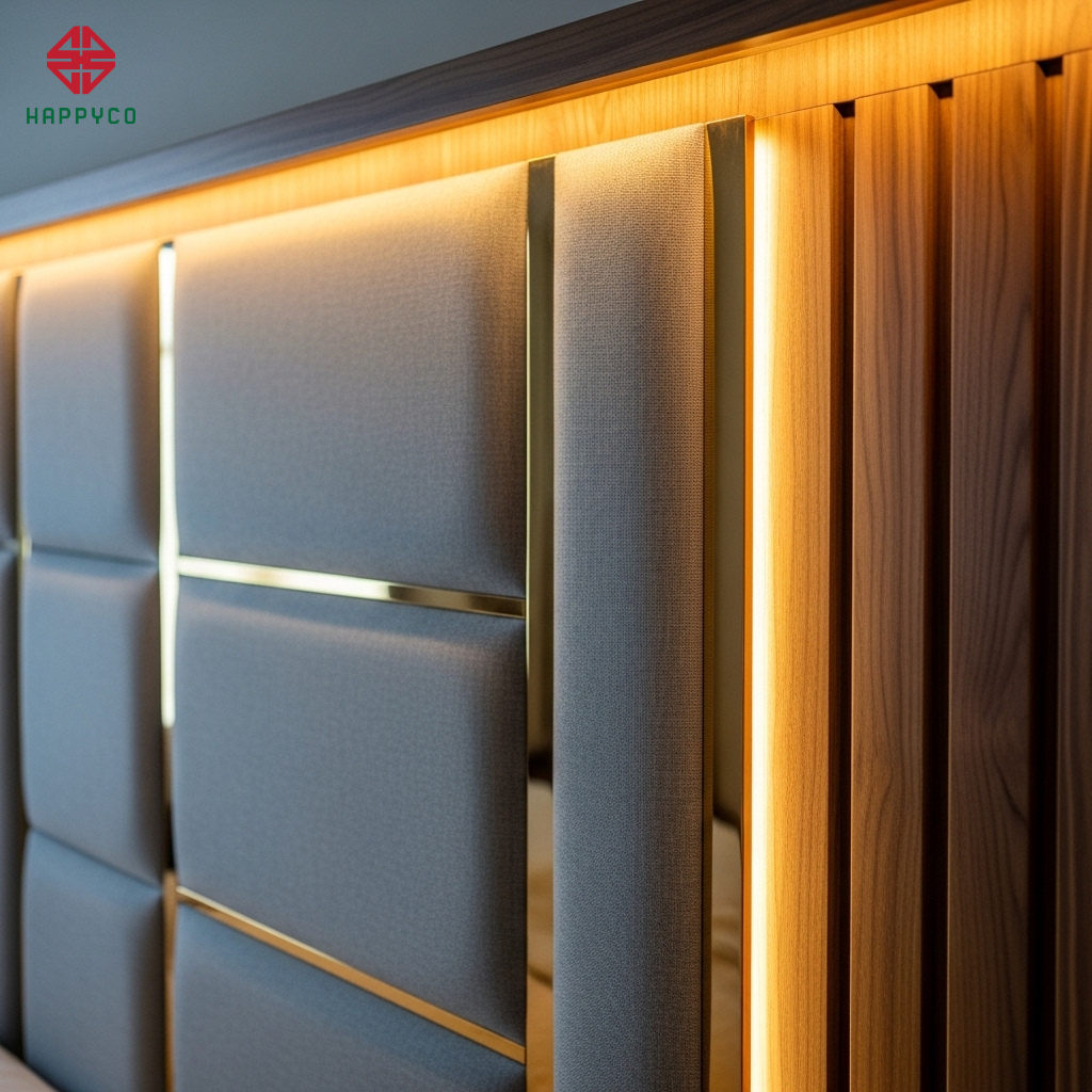 Cấu tạo vách: Kết hợp giữa ván phủ vải (Textile) tạo sự êm ái và nẹp Inox PVD tạo sự sang trọng. Đường nẹp kim loại không chỉ là trang trí mà còn mang hành Kim, giúp không gian thêm phần sắc sảo và cân bằng.