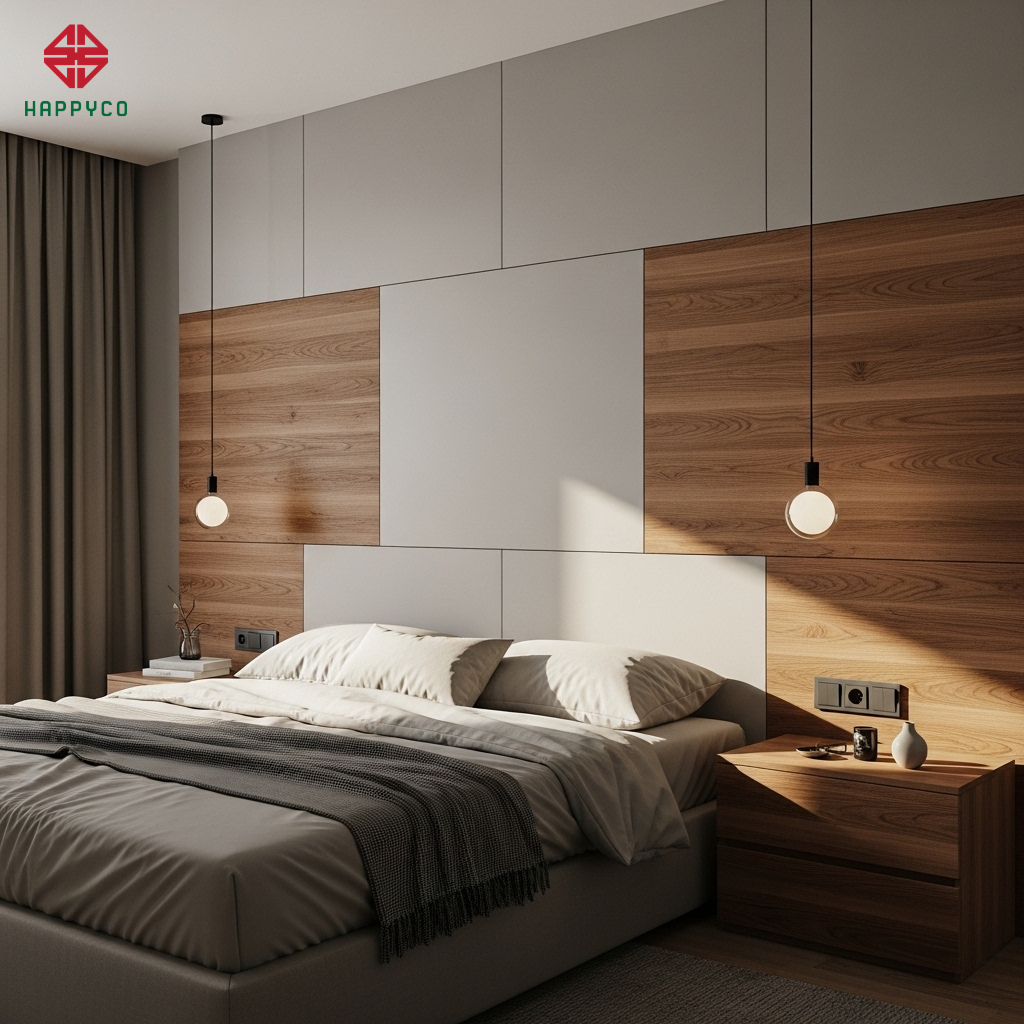 Vị trí đầu giường cần sự yên tĩnh và chắc chắn. Happy Décor sử dụng kỹ thuật ốp vách đa lớp để tạo ra một "điểm tựa" hoàn hảo: