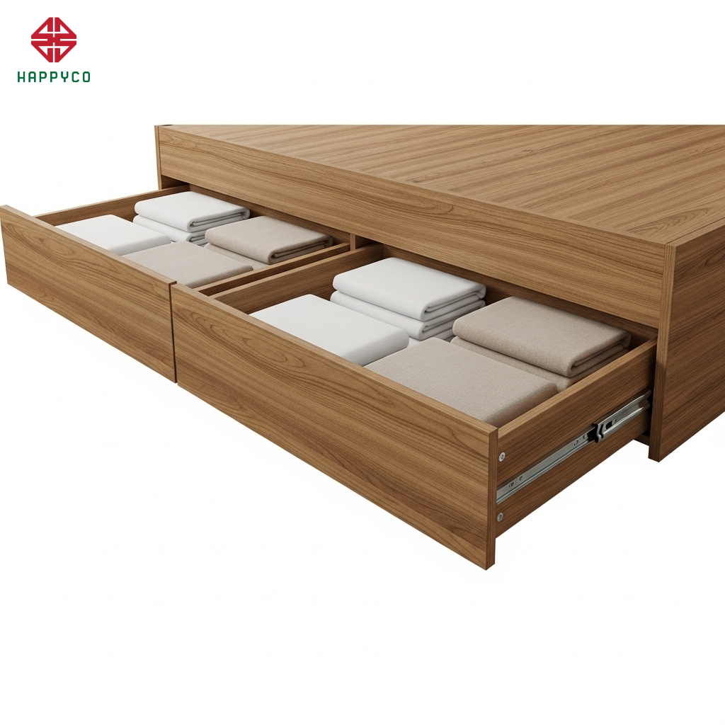 Hệ ngăn kéo âm: Phía dưới bục, chúng tôi tích hợp các ngăn kéo sử dụng ray trượt giảm chấn để đựng chăn ga, gối đệm. Một căn phòng gọn gàng, đồ đạc được cất giấu kín đáo sau lớp ván Melamine phẳng tắp chính là điều kiện tiên quyết để luồng khí tốt (vượng khí) lưu thông thuận lợi.