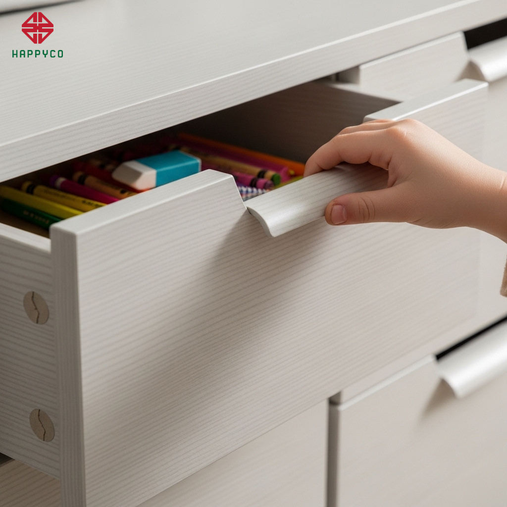 Góc vát mặt bàn: Chúng tôi áp dụng kỹ thuật phay vát nhẹ cạnh trước mặt bàn. Chi tiết này giúp giảm áp lực lên cổ tay của trẻ khi viết bài hoặc sử dụng máy tính trong thời gian dài, một yếu tố nhỏ nhưng thể hiện sự tinh tế trong kỹ thuật mộc gia đình.