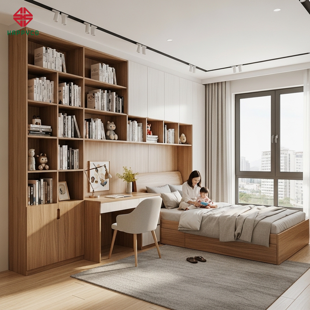 Kết cấu xương cá âm: Happy Décor sử dụng ván công nghiệp lõi xanh dày 17mm với hệ xương chịu lực đan xen phía sau. Các đợt kệ được liên kết bằng cam chốt âm chắc chắn, đảm bảo chịu được trọng lượng hàng trăm cuốn sách mà không hề bị biến dạng.