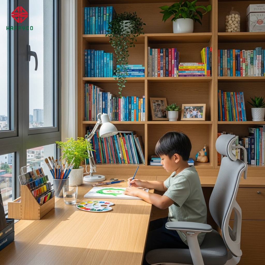 Trong kỷ nguyên số, khi trẻ nhỏ dành phần lớn thời gian ngồi bên bàn học, một bộ bàn ghế không chuẩn kích thước sẽ là "kẻ thù" thầm lặng gây ra các bệnh lý về cột sống và thị lực. Tại Happy Décor, chúng tôi không chỉ đóng những chiếc bàn gỗ vô hồn. Bằng sự am hiểu về nhân trắc học của trẻ em Việt Nam và kỹ thuật chế tác mộc tinh xảo, chúng tôi kiến tạo nên những góc học tập "công thái học" – nơi sự thoải mái của cơ thể kích thích sự thăng hoa của trí tuệ.