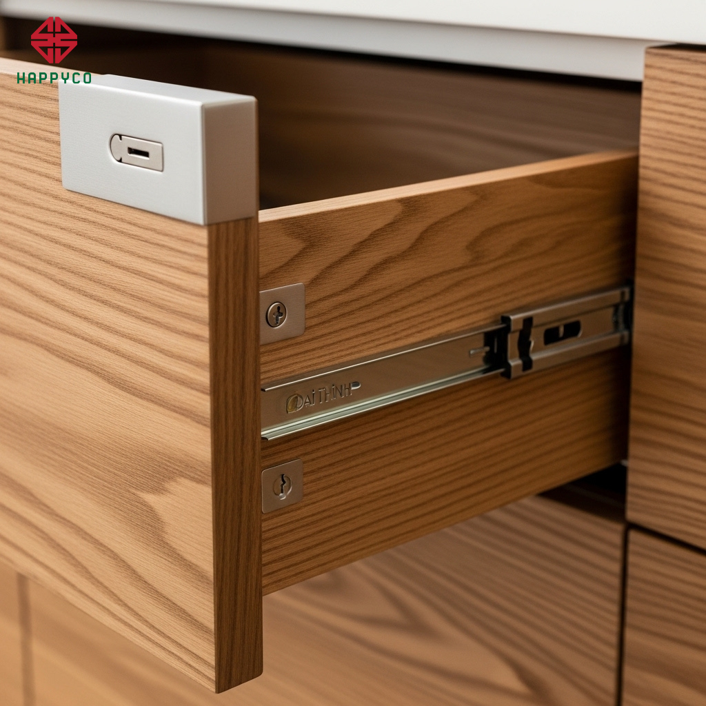 Cơ khí chính xác: Sự khít khao của cánh tủ thực tế phụ thuộc hoàn toàn vào hệ ngũ kim cao cấp từ Ngũ Kim Đại Thịnh. Chúng tôi sử dụng các dòng bản lề giảm chấn, ray trượt thông minh giúp mọi chuyển động trong ngôi nhà trở nên tĩnh lặng tuyệt đối.