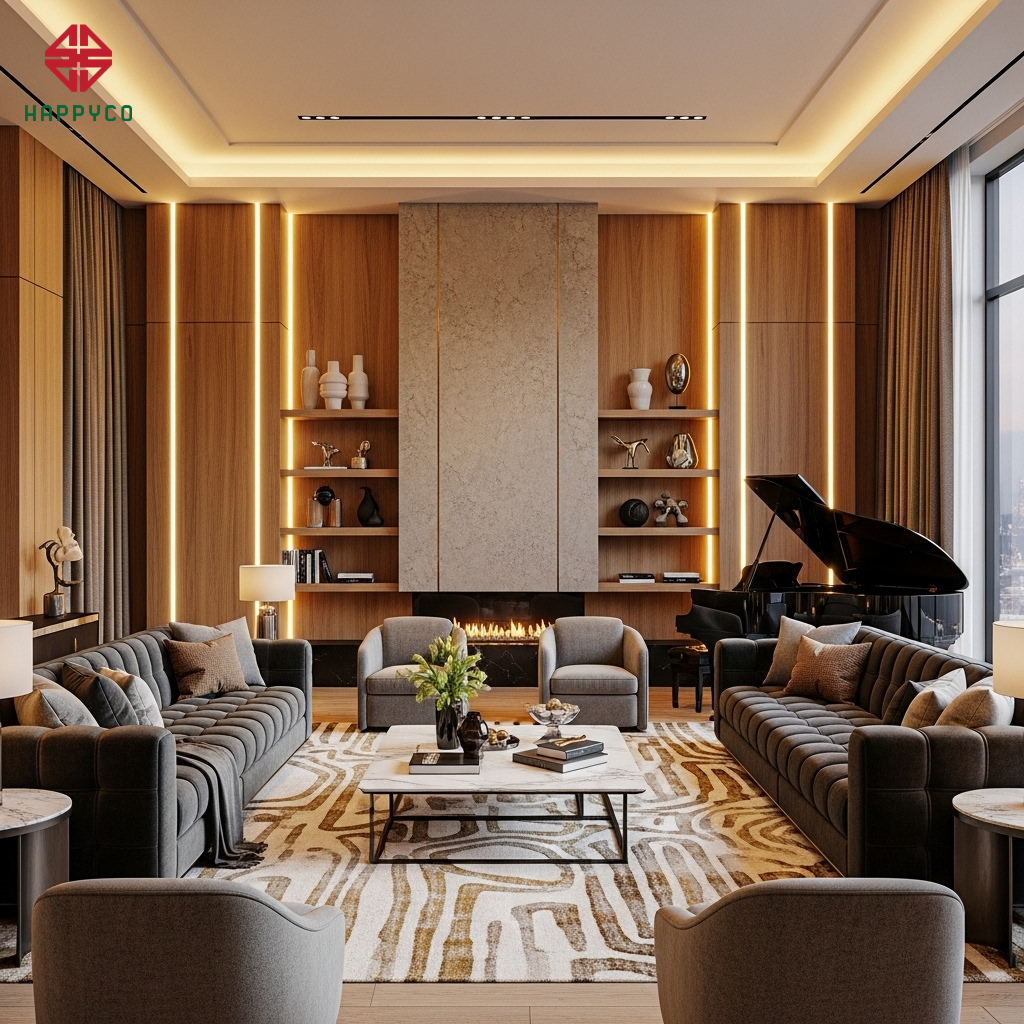 LED Kịch bản: Chúng tôi lắp đặt hệ thống đèn LED âm với nhiệt độ màu chuẩn xác, tôn vinh thớ gỗ và đường vân của đá tự nhiên. Ánh sáng thực tế khi đổ bóng lên những bề mặt được thi công sắc sảo tạo ra một không gian có chiều sâu, điều mà các công cụ render 3D đôi khi làm hơi quá đà hoặc thiếu chân thực.