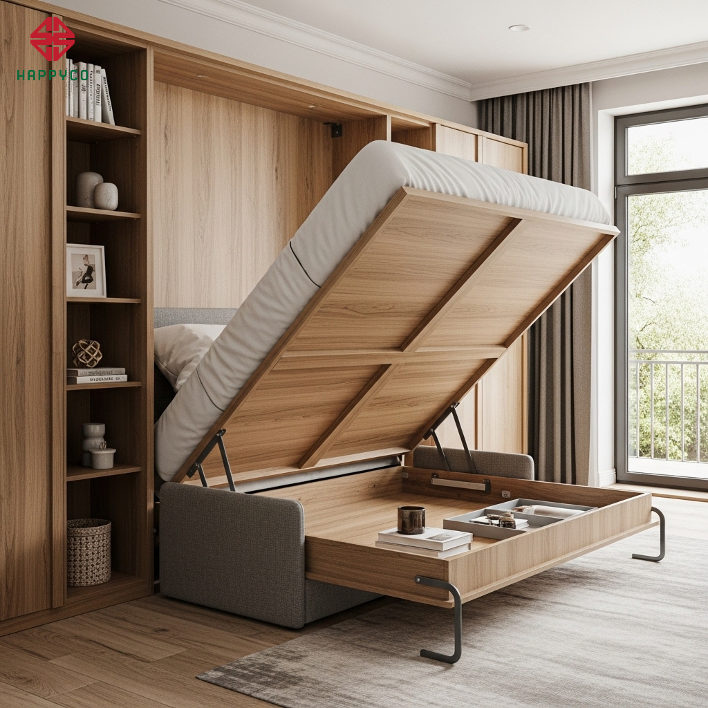 Công năng kép: Mặt dưới của giường khi gấp lên có thể là một hệ kệ trang trí hoặc một chiếc sofa nhỏ. Chỉ với một khoản đầu tư, bạn sở hữu đồng thời một phòng khách sang trọng và một phòng ngủ ấm cúng. Độ phẳng và sự khít khao của ván HMR giúp hệ giường này khi đóng lại trông như một mảng tường trang trí tinh tế.