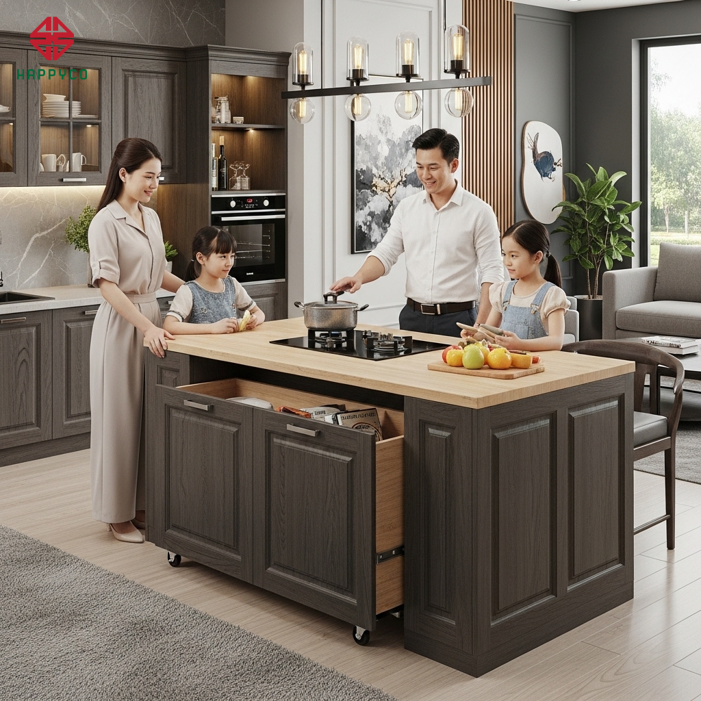 Khả năng biến hình: Một chiếc bàn đảo bếp có thể di chuyển ra giữa nhà để làm bàn tiệc cho 8-10 người khi có khách, hoặc thu gọn lại sát tủ bếp để mở rộng lối đi hàng ngày.