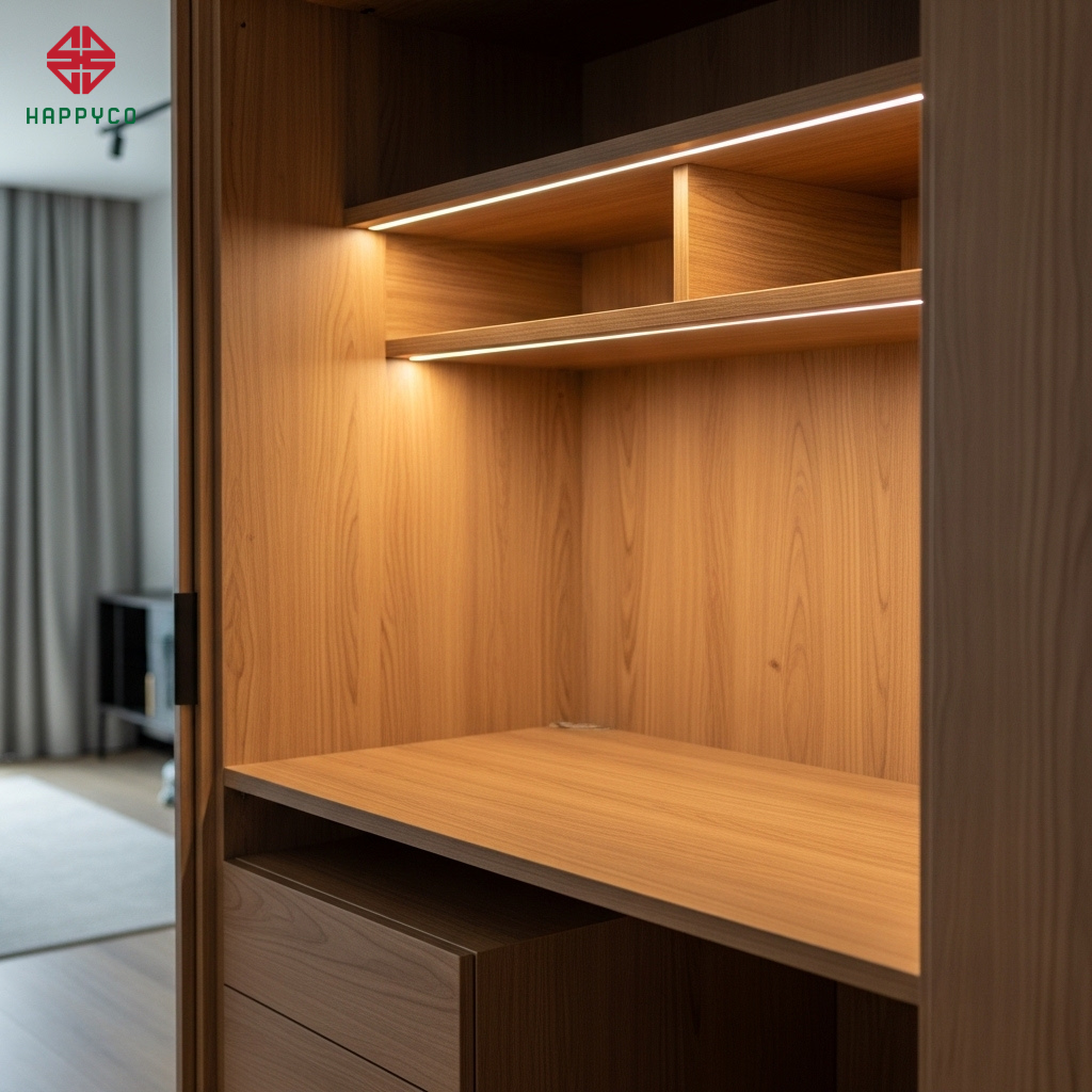 Tính bền vững: Việc sử dụng cốt ván HMR chống ẩm giúp các module di động này không bị biến dạng hay xệ cánh trong quá trình di chuyển thường xuyên. Đây là cách chúng tôi kéo dài tuổi thọ sản phẩm và giúp gia chủ không phải tốn tiền thay thế nội thất sau vài năm sử dụng.