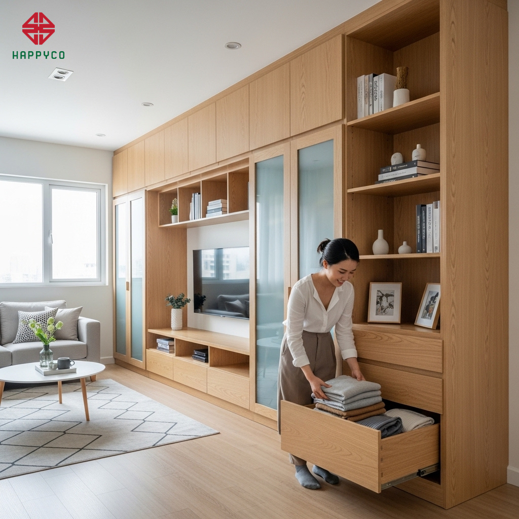 Kỹ thuật thực hiện: Happy Décor thay thế bằng hệ vách tủ kịch trần (Floor-to-ceiling) chạy dọc theo một mảng tường lớn. Hệ vách này được thi công từ các module ván HMR dày $17\text{mm}$ để đảm bảo chịu lực kéo và nén tốt nhất.