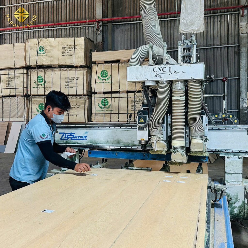 Tại sao lại rẻ hơn? Chúng tôi tiết kiệm được 10% nhờ giảm hao hụt ván HMR Kho Mộc, 5% nhờ tốc độ sản xuất CNC nhanh và 5% nhờ quy trình lắp đặt tại công trình sạch sẽ, không cần chỉnh sửa nhiều.