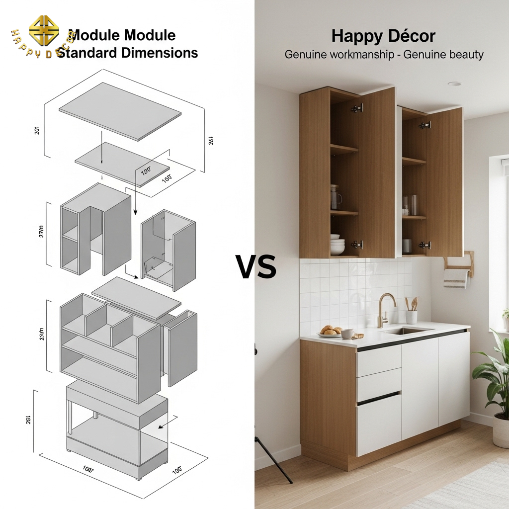 Trong bối cảnh kinh tế năm 2026, khách hàng không còn vung tiền cho những thiết kế xa hoa lãng phí, nhưng họ cũng không chấp nhận những sản phẩm giá rẻ kém chất lượng. Bài toán đặt ra cho đội ngũ thợ mộc Happy Décor là: Làm sao để một căn hộ sử dụng 100% ván HMR cốt xanh của Kho Mộc lại có giá thành cạnh tranh hơn so với thị trường tới 20%? Câu trả lời không nằm ở việc giảm chất lượng vật liệu, mà nằm ở Kỹ thuật Module hóa (Standardized Modularity).
