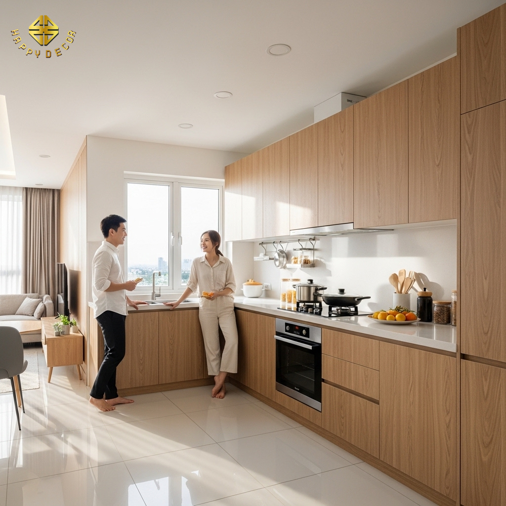 Giá trị thực bền vững: Tiết kiệm ở đây không phải là dùng gỗ rẻ tiền. Happy Décor vẫn dùng ván HMR cốt xanh cao cấp nhất của Kho Mộc để chống ẩm, chống mối mọt. Chúng tôi chỉ loại bỏ sự lãng phí trong quy trình làm việc. Kết quả cuối cùng là một ngôi nhà sang trọng, bền bỉ qua hàng chục năm nhưng giá thành lại cực kỳ dễ tiếp cận với đại đa số gia đình trẻ hiện nay.