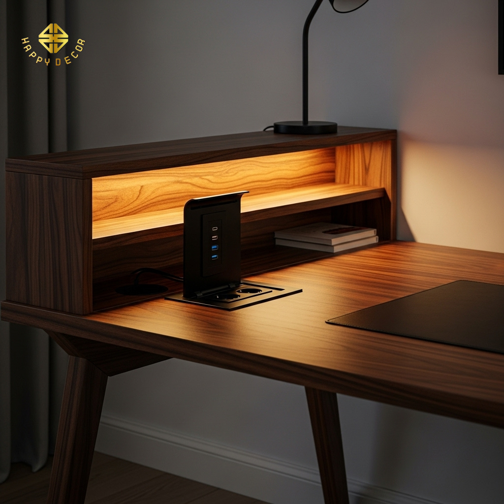 Hộp điện kỹ thuật: Thay vì khoan lỗ tròn thô kệch trên mặt bàn, chúng tôi sử dụng hộp điện âm bật nắp (Pop-up) tích hợp cổng sạc USB và ổ cắm đa năng.