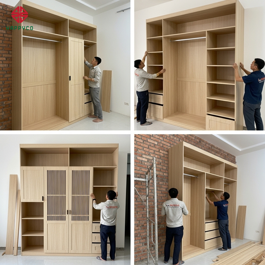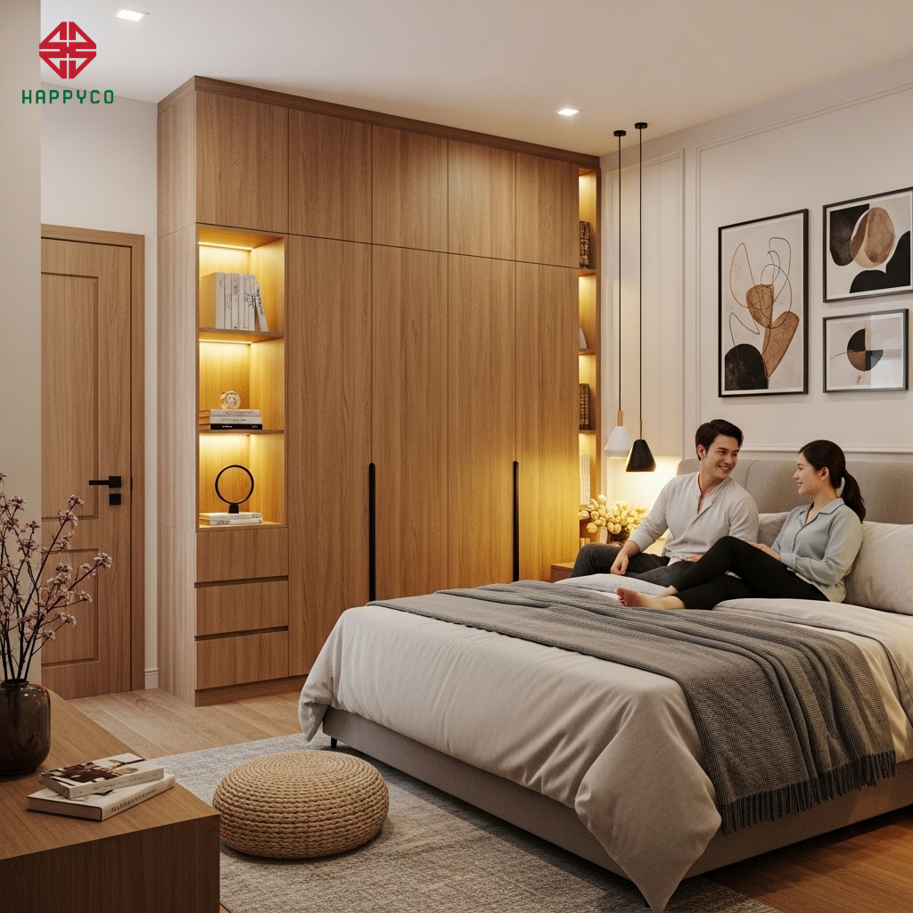 Trong các căn hộ phố và chung cư hiện đại tại Biên Hòa, diện tích phòng ngủ thường bị giới hạn. Việc sử dụng tủ quần áo rời thông thường sẽ tạo ra những "khoảng chết" đầy bụi bẩn phía trên nóc tủ. Tại Happy Décor, chúng tôi thay thế bằng Kỹ thuật thi công kịch trần (Floor-to-ceiling). Đây là giải pháp kiến trúc giúp xóa bỏ mọi góc chết, biến hệ tủ thành một bức tường phẳng tắp, sang trọng và gia tăng thêm 30% không gian lưu trữ.