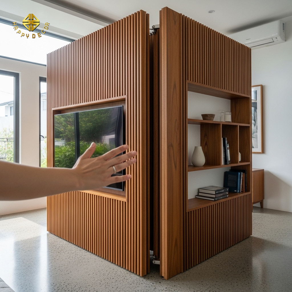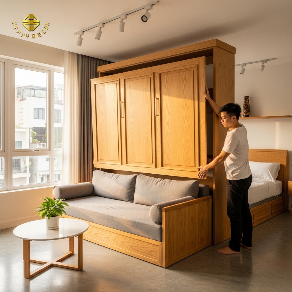 Happy Décor mang đến giải pháp Transformable Hub (Trung tâm chuyển đổi). Bằng cách ứng dụng các hệ thống phụ kiện cơ khí thông minh vào nội thất gỗ, chúng tôi giúp một căn phòng duy nhất có thể thực hiện tốt 3-4 công năng khác nhau, giúp gia chủ "ăn gian" thêm ít nhất 30% diện tích sử dụng thực tế.