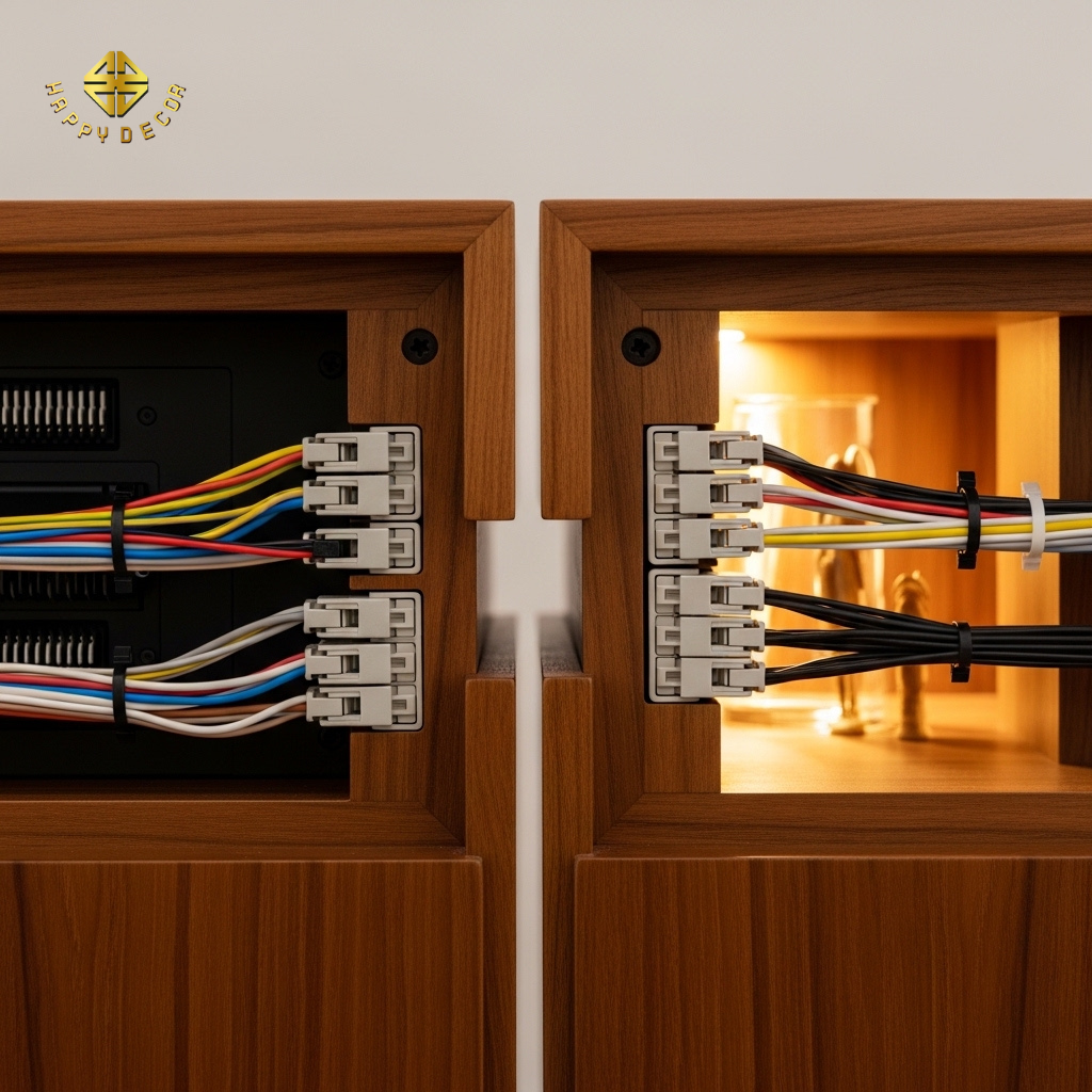 Tích hợp kỹ thuật: Mỗi module tủ gỗ của Happy Décor đều có hệ thống dây dẫn và ổ cắm âm sẵn bên trong.