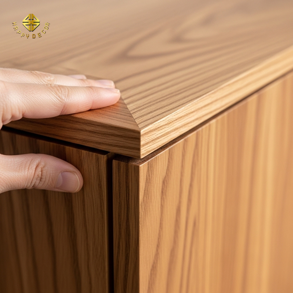 Xử lý nghệ nhân: Happy Décor sử dụng máy cắt CNC chính xác để vát cạnh gỗ đúng 45°. Các cạnh này sau đó được ghép lại bằng keo chuyên dụng và hệ vam kẹp áp suất cao.
