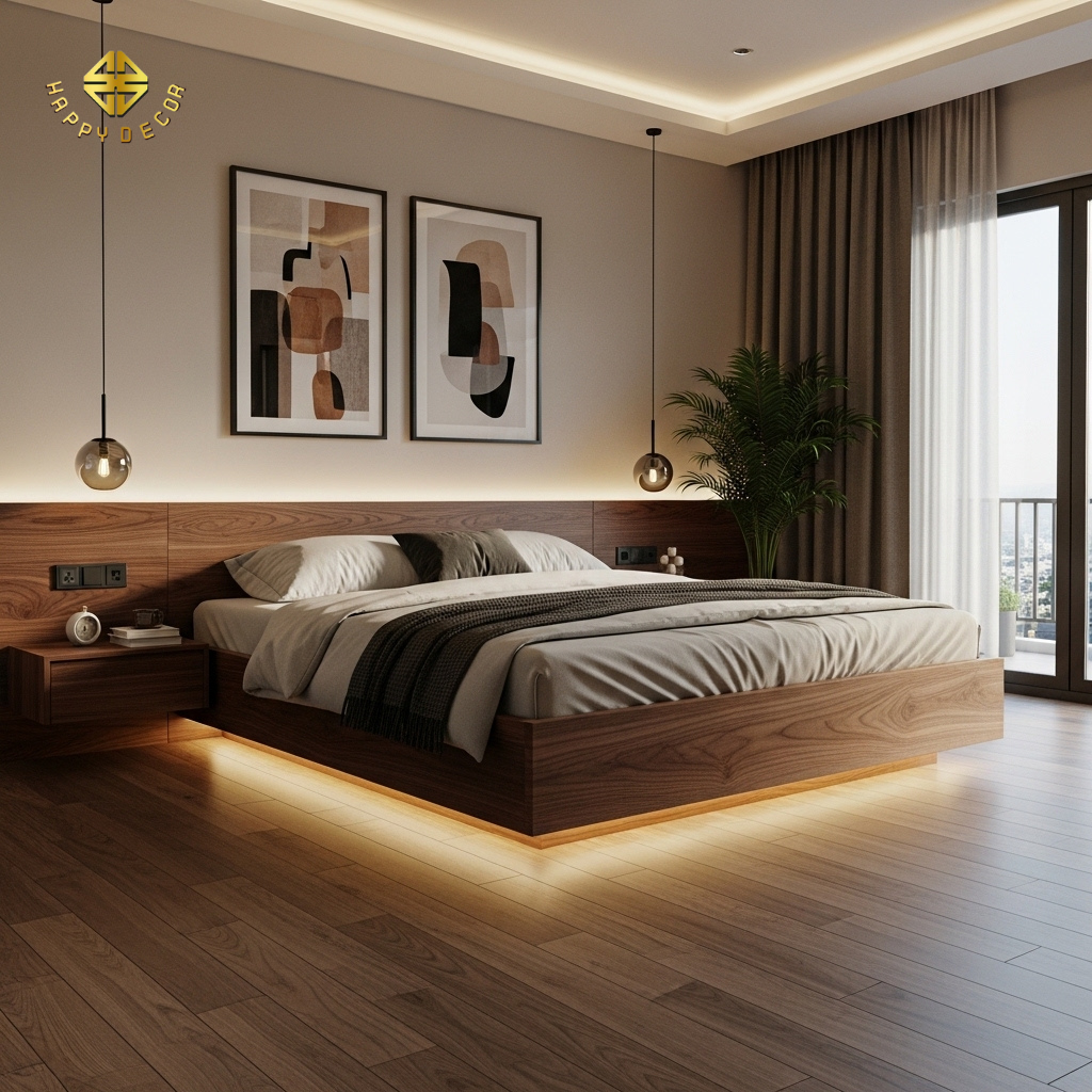 Hiệu ứng thị giác: Khi đứng ở tầm mắt bình thường, chân trụ hoàn toàn bị che khuất. Toàn bộ khối giường gỗ như đang nổi trên mặt sàn. Kết hợp với dải đèn LED cảm biến dưới gầm, chiếc giường trở thành một điểm nhấn công nghệ đầy mê hoặc.