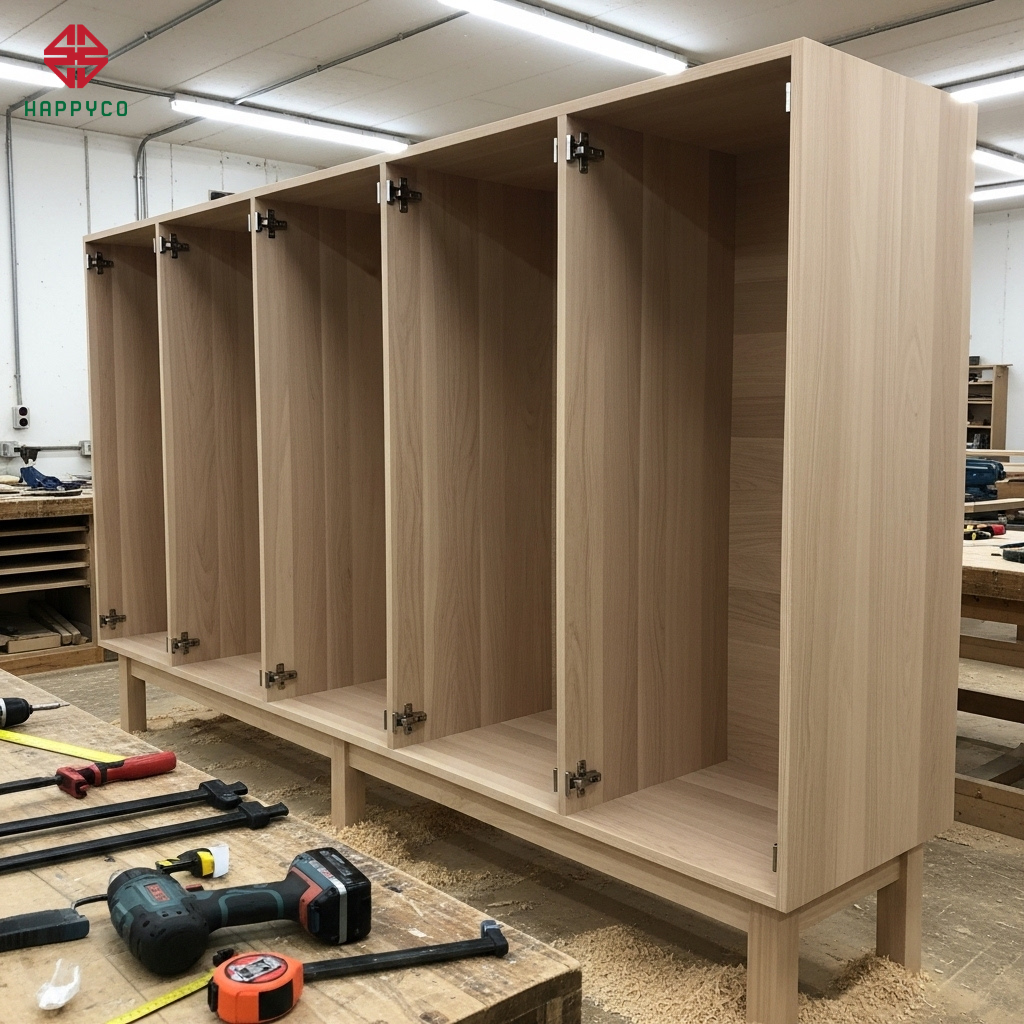 Kỹ thuật mộc hiện đại: Chúng tôi sử dụng kỹ thuật liên kết cam chốt để thi công các hệ tủ lớn theo dạng chung vách. Điều này giúp giảm khoảng $15\%$ lượng ván mộc sử dụng mà vẫn đảm bảo kết cấu cực kỳ vững chãi.