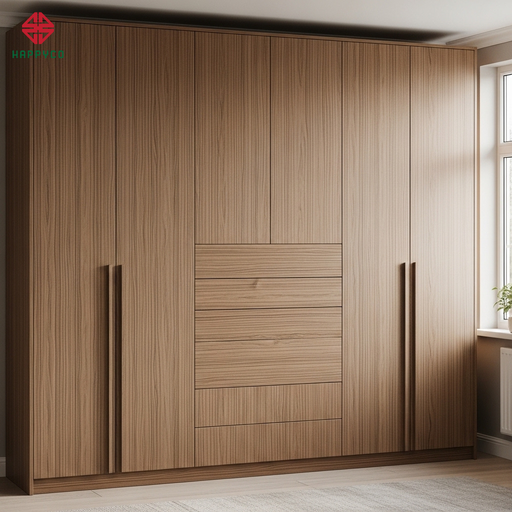 Tạo nhịp điệu không gian: Thợ mộc Happy Décor sử dụng vân đứng cho cánh tủ kịch trần để kéo cao căn phòng, và vân ngang cho các hộc kéo hoặc kệ trang trí để tạo chiều sâu.