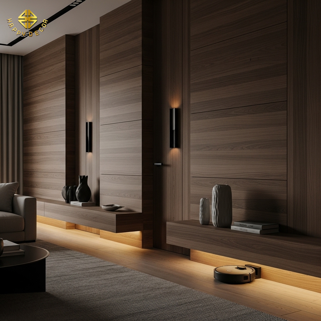 Giải pháp Happy Décor: Chúng tôi không ốp ván chạm sàn. Thay vào đó, một khe hở kỹ thuật từ 10--15mm được tạo ra tại điểm tiếp nối giữa vách mộc và mặt sàn. Khe hở này tạo ra một dải bóng tối tự nhiên, che đi mọi sự sai lệch về cao độ, tạo hiệu ứng thị giác khiến bức tường như thoát ly khỏi mặt đất.