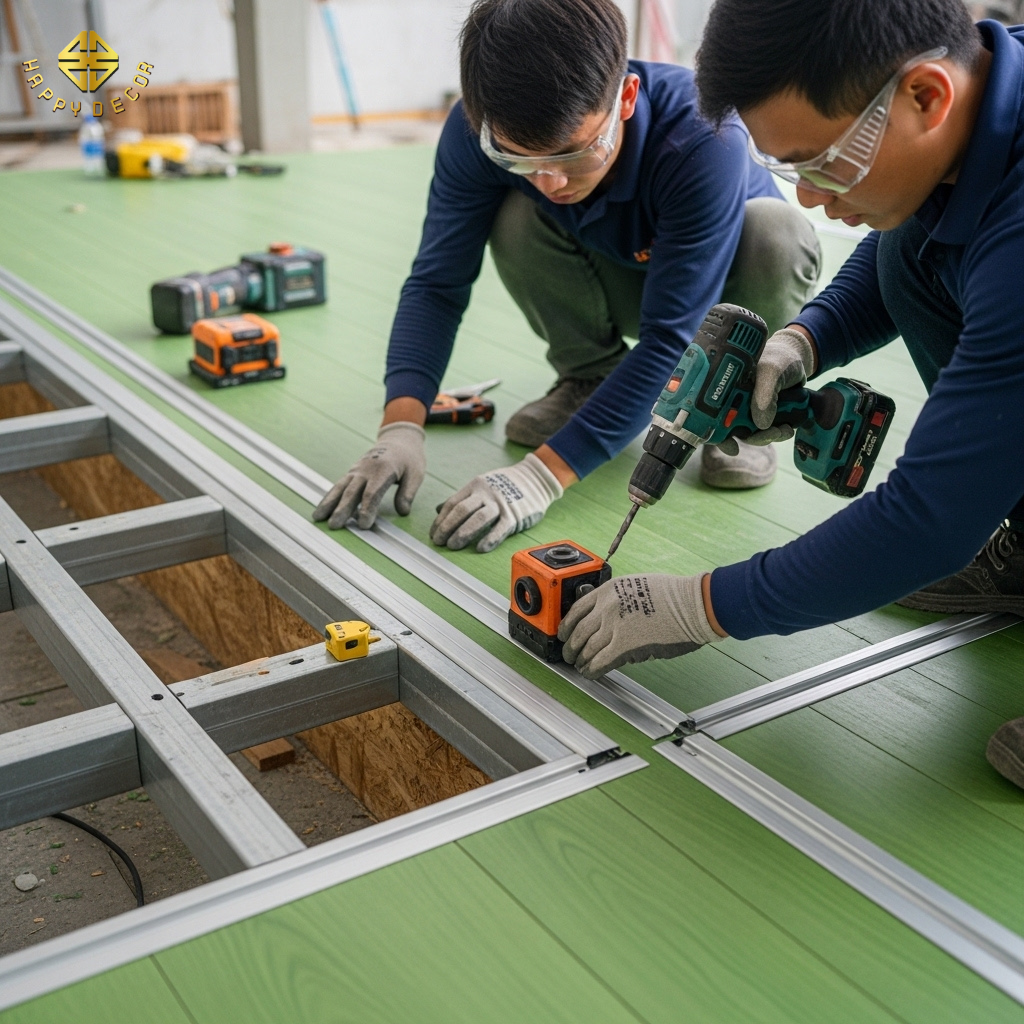 Khả năng chịu lực: Dù trông có vẻ lơ lửng, nhưng hệ vách mộc được Happy Décor gia cường bằng khung xương gỗ HMR bắn trực tiếp vào tường gạch bằng vít nở chuyên dụng. Kết cấu này đảm bảo vách tường chịu được mọi va đập từ máy hút bụi hay đồ đạc mà không hề rung lắc hay nứt vỡ.