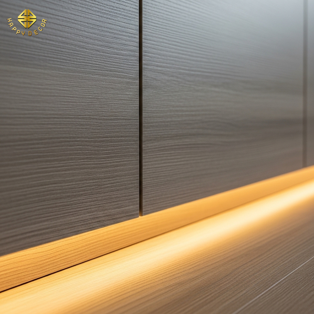 Trong các bản vẽ 3D kiến trúc hiện đại, bạn thường thấy những mảng vách gỗ hoặc tường thạch cao trông như đang "bay" lơ lửng, không chạm sàn. Đó chính là hiệu ứng của Shadow Gap (Khe bóng đổ). Để biến những đường kẻ mảnh mai trên máy tính thành hiện thực sắc nét, thợ mộc Happy Décor phải phối hợp nhịp nhàng giữa cốt ván HMR của Kho Mộc và các hệ nẹp kỹ thuật.
