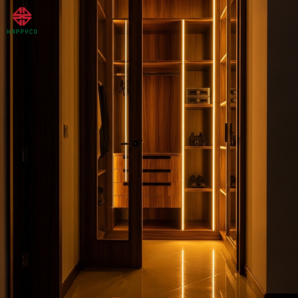 Cảm biến tiệm cận: Mỗi khi mở cánh tủ, hệ thống đèn LED 4000K giấu dọc theo các đợt ván sẽ tự động bừng sáng. Chúng tôi sử dụng kỹ thuật phay rãnh CNC âm vào ván để giấu dải đèn, chỉ để lộ ánh sáng hắt nhẹ ra ngoài.