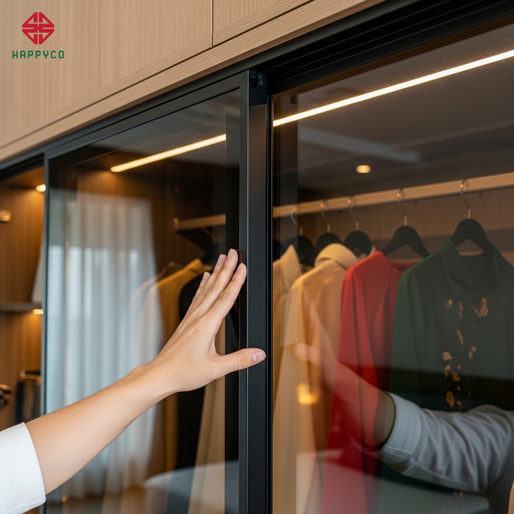 Logic vận hành: Ray trượt được âm hoàn toàn vào sàn gỗ và trần tủ. Khi đóng mở, cánh kính lướt nhẹ nhàng như không trọng lượng. Sự kết hợp giữa ván HMR lõi xanh chống ẩm làm thùng tủ và cánh kính khung nhôm tạo nên một sự tương phản vật liệu cực kỳ sang trọng, biến chiếc tủ thành một tác phẩm triển lãm ngay trong phòng ngủ.