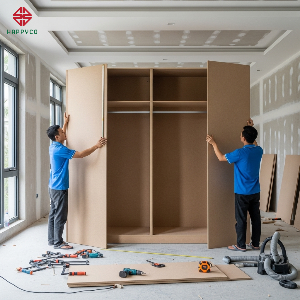 Trong thiết kế kiến trúc nhà phố hiện đại, việc sử dụng tường gạch dày 10--20cm để ngăn chia phòng ngủ và phòng thay đồ đã trở nên lỗi thời. Xu hướng 2026 là sử dụng chính những hệ nội thất làm "vách ngăn cơ động". Tuy nhiên, để một hệ tủ quần áo cao kịch trần 3m, dài 4m đứng vững, phẳng tắp và đẹp như bản vẽ 3D mà không có tường tựa, đòi hỏi một tư duy logic về kết cấu và kỹ thuật thi công cực kỳ gắt gao từ người thợ Happy Décor.