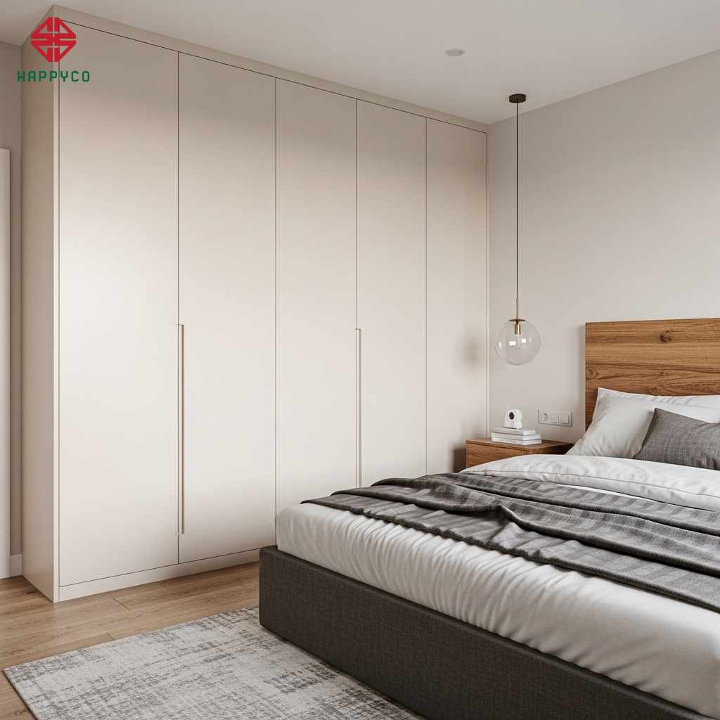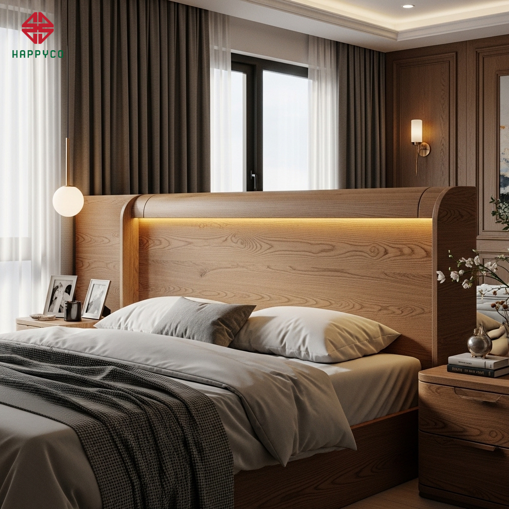 Ánh sáng âm vách: Happy Décor tích hợp các khe đèn LED hắt ngang từ vách gỗ MDF thay vì đèn chùm trực diện. Ánh sáng dịu nhẹ này giúp cân bằng âm dương, khiến phòng ngủ trở thành một chốn về thực sự bình yên và ấm áp cho mọi cặp vợ chồng Việt.