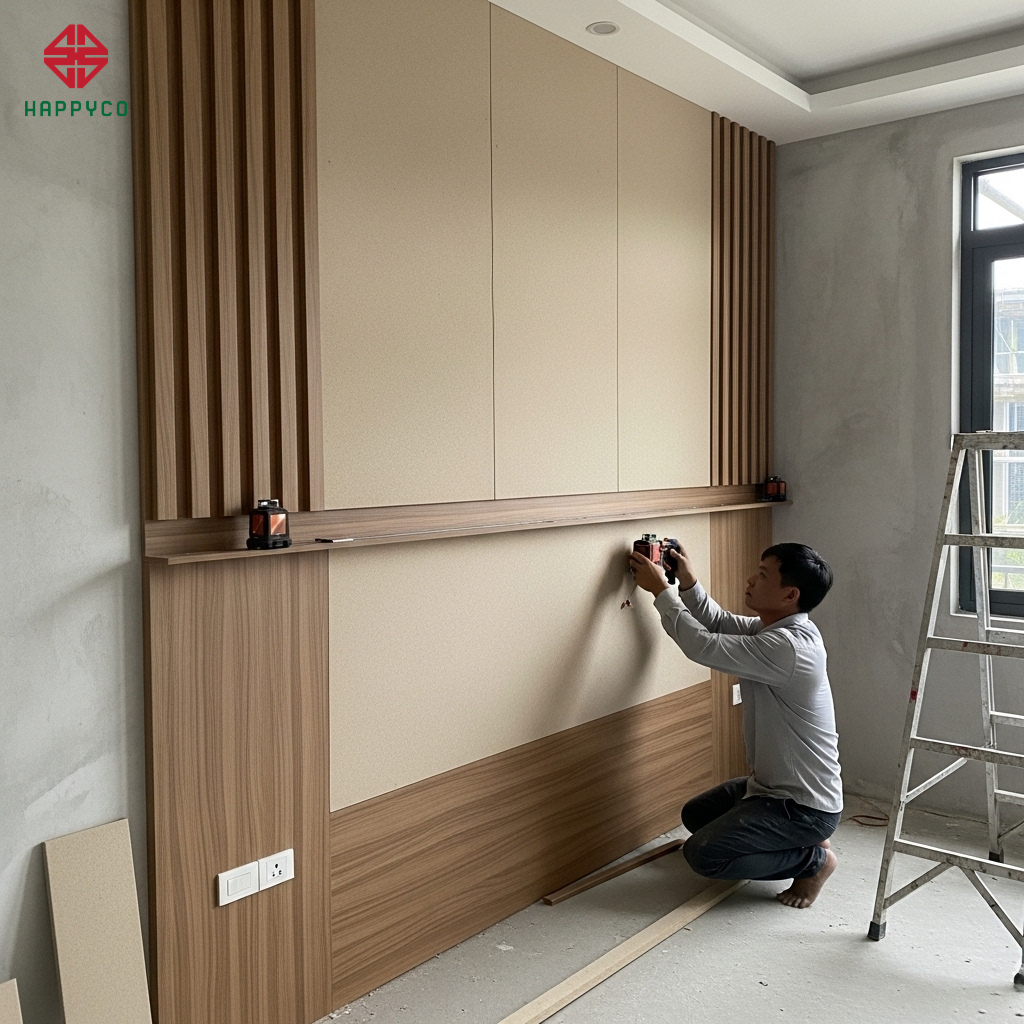 Trong quan niệm phong thủy, đầu giường là "điểm tựa" của vận mệnh. Một giấc ngủ ngon không chỉ đến từ chiếc nệm êm, mà còn từ sự vững chãi của không gian bao quanh. Tại Happy Décor, chúng tôi sử dụng kỹ thuật mộc hiện đại với ván lõi xanh để biến những bức tường trống trải thành những hệ vách "tựa sơn" vững chãi, giúp gia chủ an tâm hưởng trọn giấc nồng.