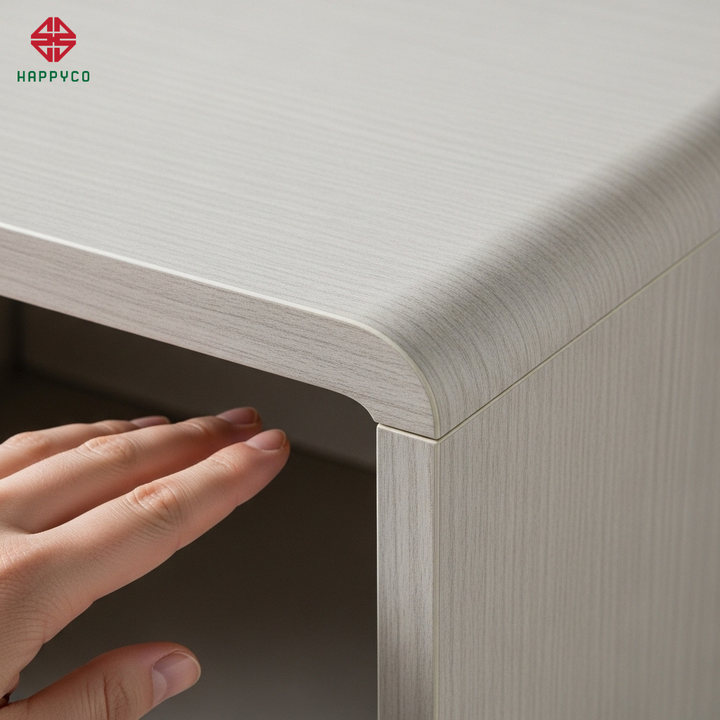 Gia công mộc tỉ mỉ: Với ván MDF, thợ mộc Happy Décor áp dụng kỹ thuật bo tròn các góc cạnh với bán kính R30--R50mm. Toàn bộ các đường bo được dán chỉ nhựa PVC đồng màu bằng máy dán cạnh tự động.
